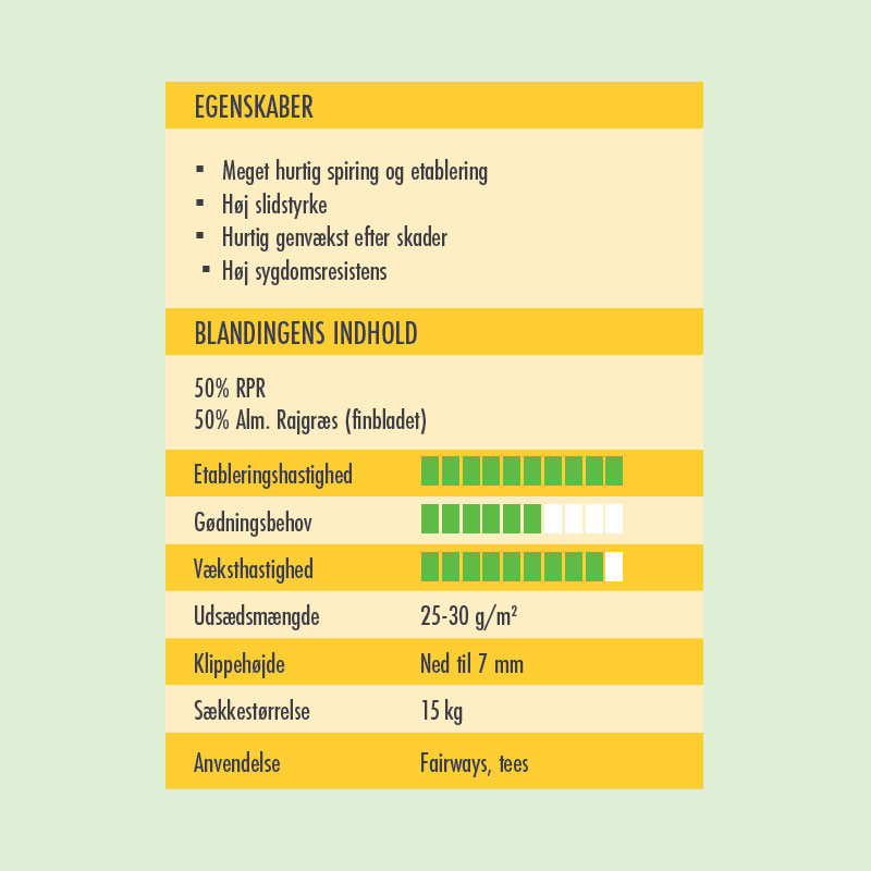 Den eksklusive blanding sikrer hurtig fremspiring og etablering, samt stor slidstyrke. Dette gør den ideel til eftersåning og reparation af almindelige græsplæne men selvfølgelig også greens, tees, fairways og på drivingrangen.