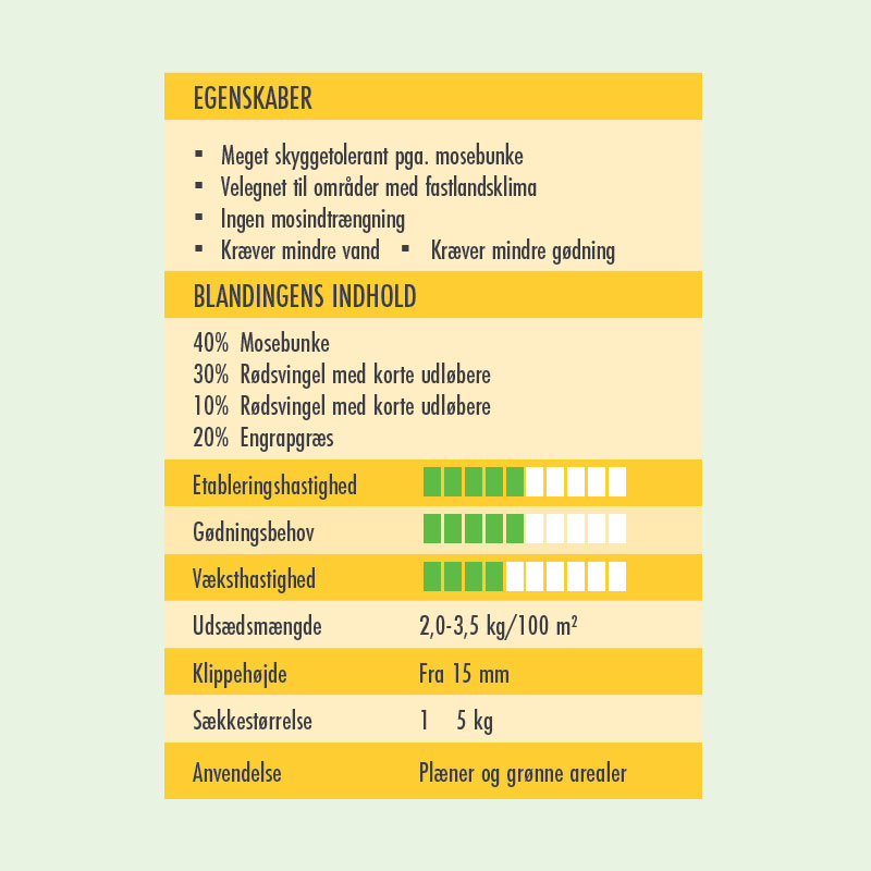 Barenbrug Shadow Plænegræs er stærk i både sol og skygge. Græsblandingen er særdeles velegnet til områder med fastlandsklima, da der ingen mosindtrængning kommer i plænen.
