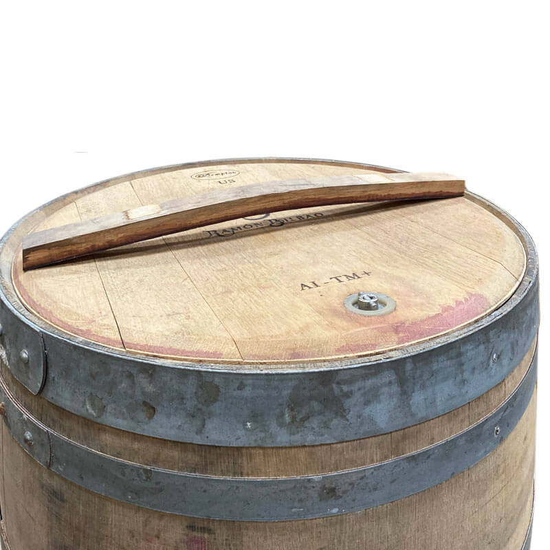Her på siden ser du vores version af en brugt vintønde med låg. Selve tønden har vi importeret direkte fra et spansk vinslot. Vintønderne er lavet af egetræ og kan indeholde 225 liter. Låget er tøndens oprindelige top, som vi har afmonteret og skruet sammen, for at det kan bruges som et funktionelt låg.
