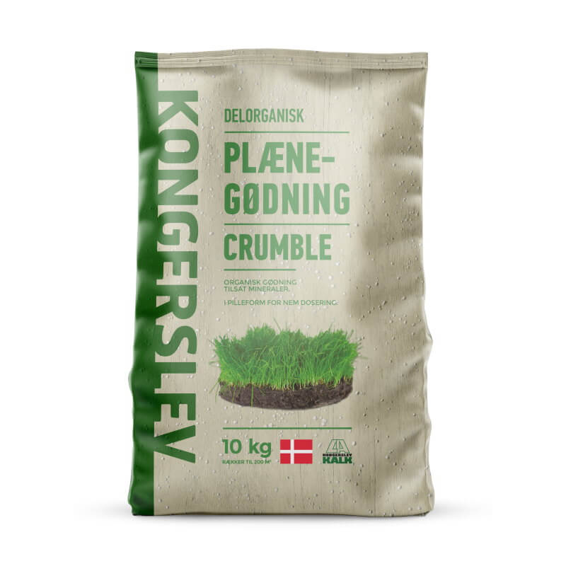 Kongerslev kalk Delorganisk gødning er en langtidsvirkende plænegødning, som er særligt høj på kvælstof. Den består af pelleteret fjerkrægødning, som består af komposteret gødning tilsat mineraler.
