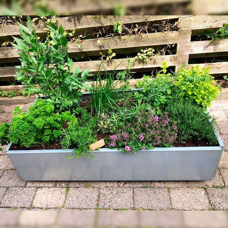 Her får du en komplet plantekasse med hjul lavet i galvaniseret jern, som ikke ruster eller tærer og derfor beholder det smukke og blanke udseende.