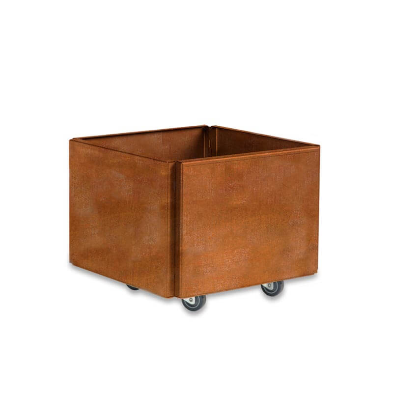 Her får du en komplet plantekasse med hjul lavet i råjern, som får et smukt rustent udseende.