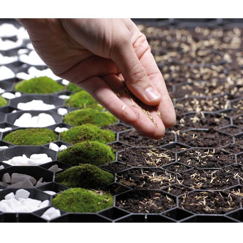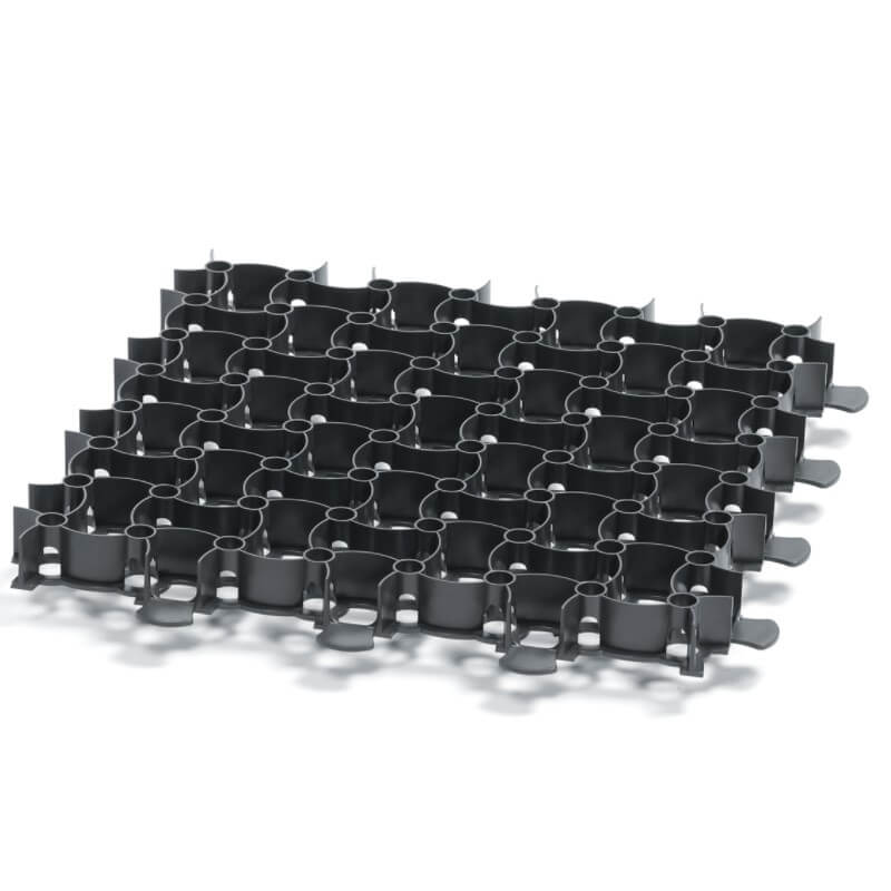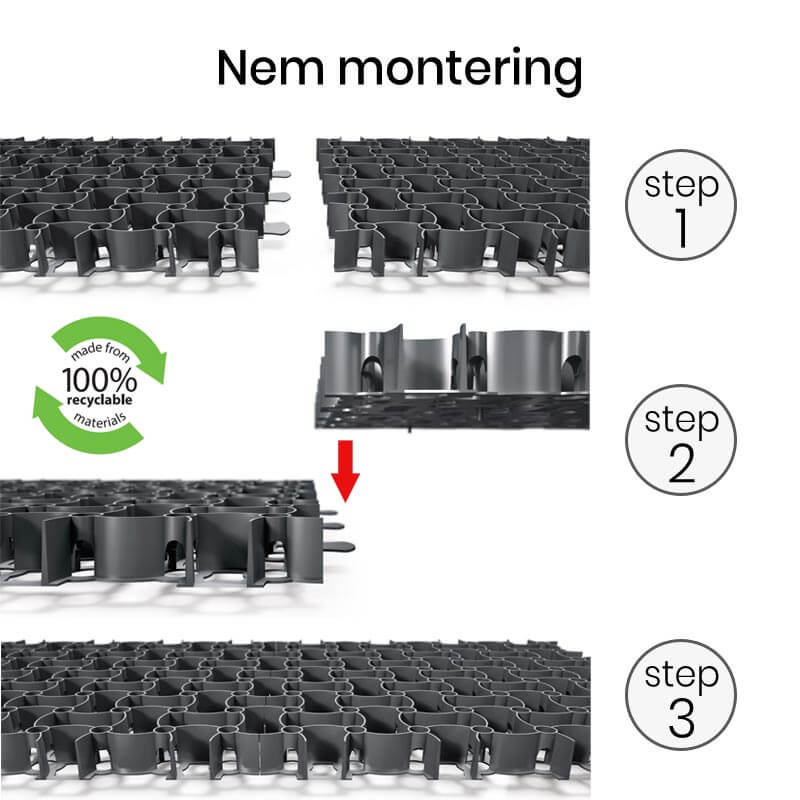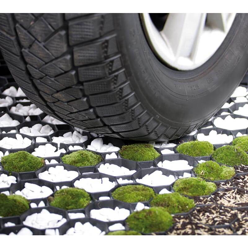 Her får du et kvalitetsprodukt, som effektivt stabiliserer jorden og forhindrer dannelsen af hjulspor. På samme tid tillader græsarmeringen vand og luft at passere til de nederste lag af substratet. Gitteret er let og nemt at samle på puslespilsbasis, og har samtidig en meget høj bæreevne, op til 16 T/m2. Græsarmering kan fyldes med grus, granitskærver eller jord, som plænen kan sås på.