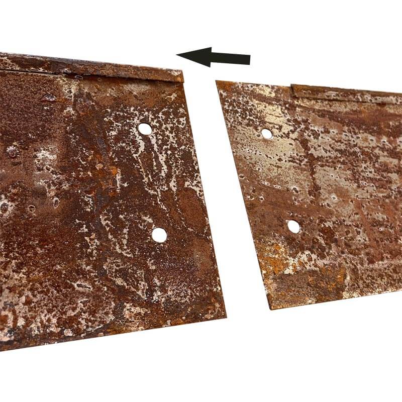Bemærk: ved modtagelse er stålet ikke rustent. Ønsker du hurtig rust, kan du tørre stålet af med en klud væddet op i vand og sulfo. Nogle af græskanterne er en anelse rustne ved modtagelse, som på billedet her. De bliver meget mere rustrød end billedet viser nu.
