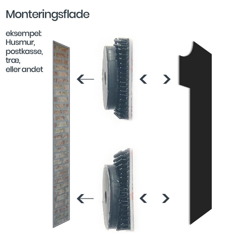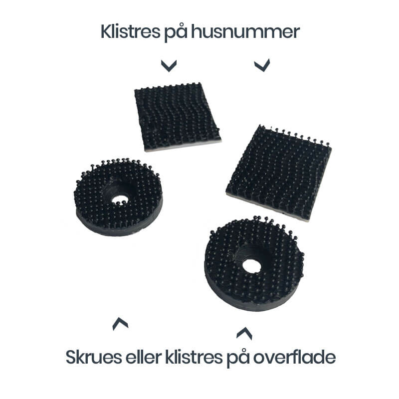 Med husnummeret følger et smart og kraftig velkrosystem til montering. Der medfølger også skruer og rawplugs, samt 10 mm afstandsstykker, så du her modtager en samlet pakke med alt der skal bruges, dog på nær værktøj.