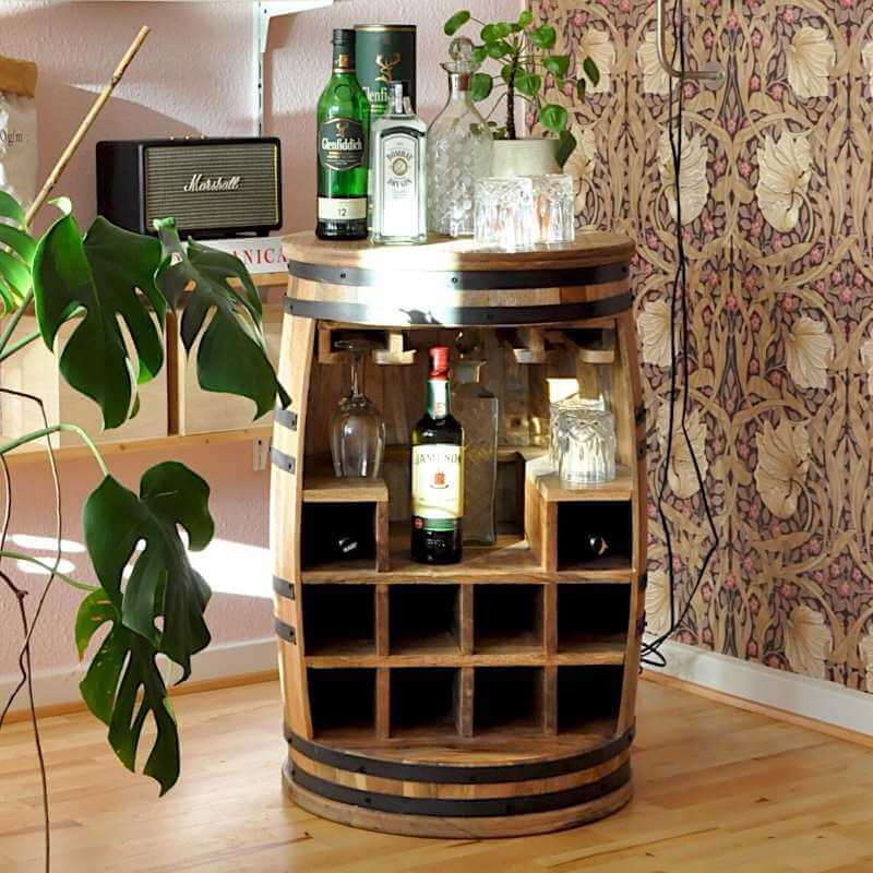 Tønden er lavet af flot, lyst og meget holdbart mangotræ med praktisk ophæng til glas, masser af opbevaringsplads og en praktisk bordplade på toppen, der både kan bruges som bardisk og bord.