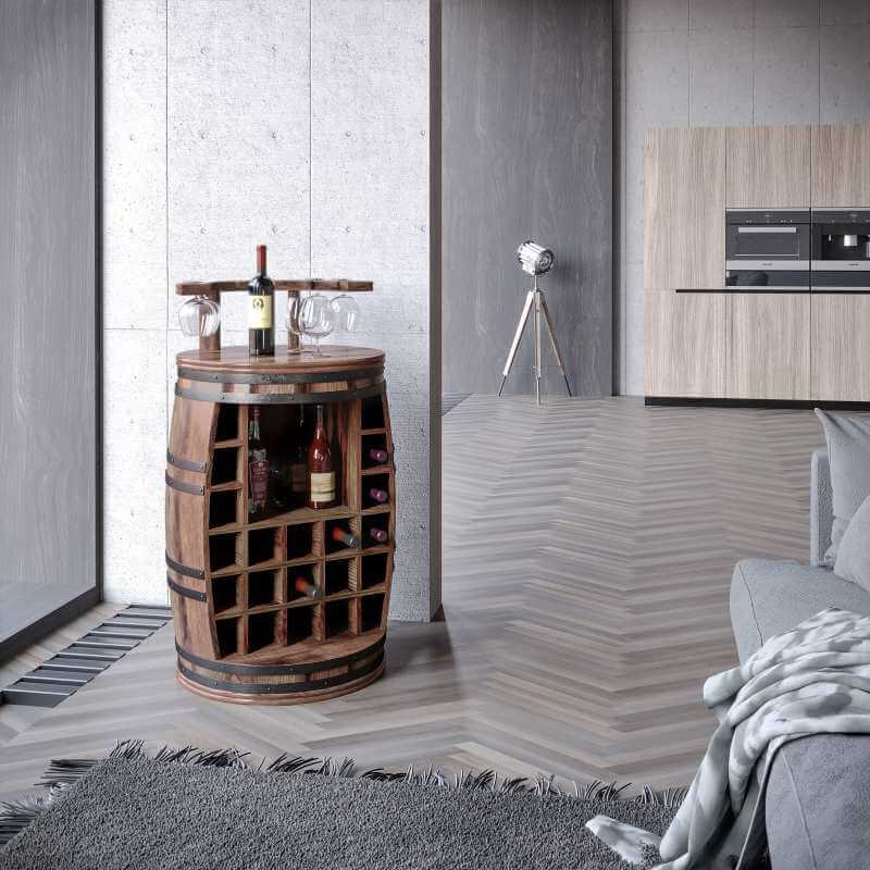 Hjemmebaren er produceret i massivt rosentræ med tydelige årer, og holdt sammen med solide, oxiderede jernringe af genbrugstræ påsat med nitter. Det giver det helt rigtige tøndelook, som får din vintønde-hjemmebar til at ligne et møbel, der er skabt af gamle vintønder.