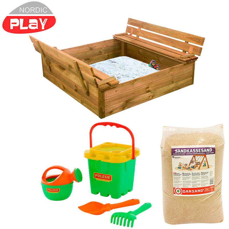 Denne sandkasse fra Nordic Play er en absolut bestseller, og det er den naturligvis fordi, man får en flot træsandkasse til en utrolig billig pris. Dette sæt er til dig som kun vil bestille din vare et sted og modtage det hele samlet. Der medfølger 240 kg sand i 20 kg. sække så du nemt kan flytte det. Legetøj medfølger som på billede.