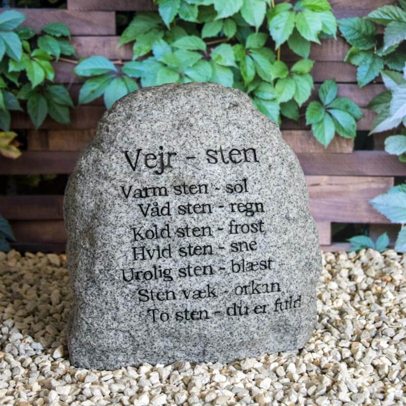 Vejrstenen kan stå diskret i kanten af et bed, eller helt inde ved terrassedøren, mulighederne er mange. En ting er dog sikkert, dine besøgende får sig et godt grin med på vejen, når de læser teksten, som kan beskrive vejret for enhver. Vejret er altid et godt samtaleemne, og det er en ting som påvirker alles hverdag i mere eller mindre grad. Derfor er en sjov vejrsten som denne en genial samtalestarter og med til at sprede en god stemning i haven.