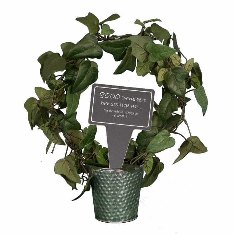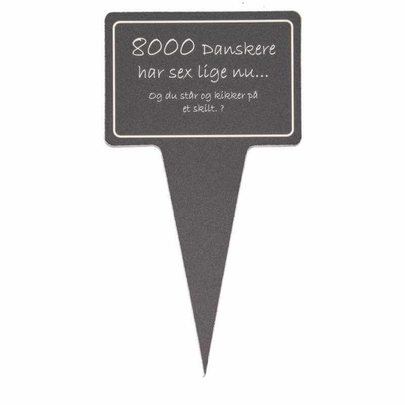 Sjovt planteskilt med teksten “8000 danskere har sex lige nu… Og du står og kigger på et skilt.?”.