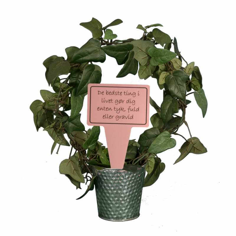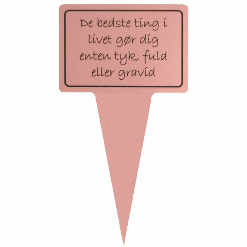 Sjovt planteskilt med teksten “De bedste ting i livet gør dig enten tyk, fuld eller gravid”.