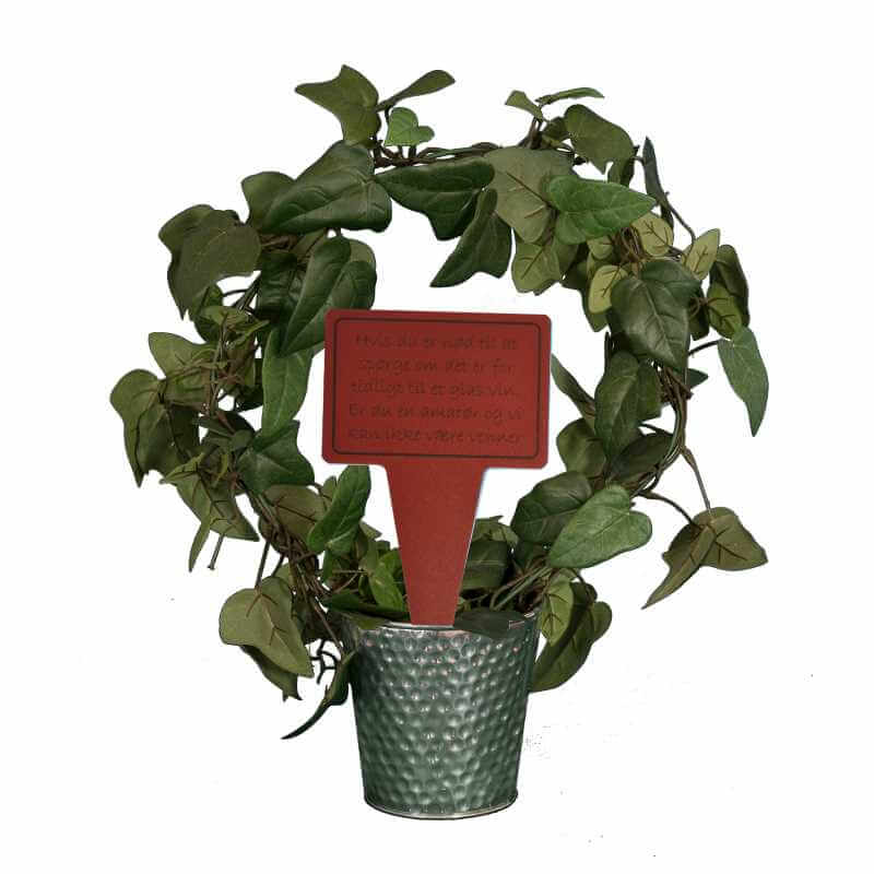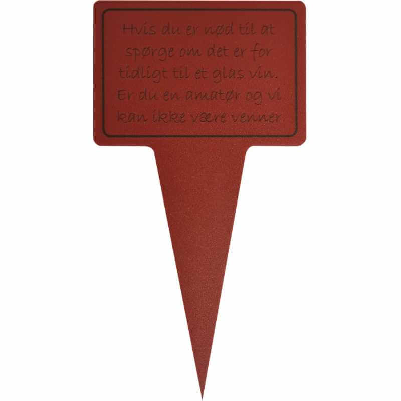 Sjovt planteskilt med teksten “Hvis du er nød til at spørge om det er for tidligt til et glas vin. Er du en amatør og vi kan ikke være venner”.