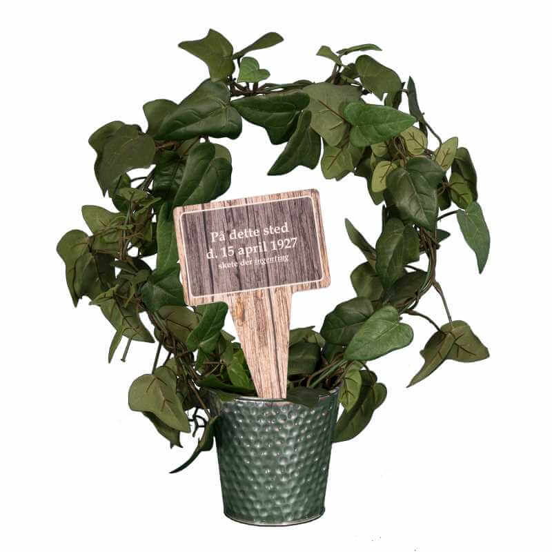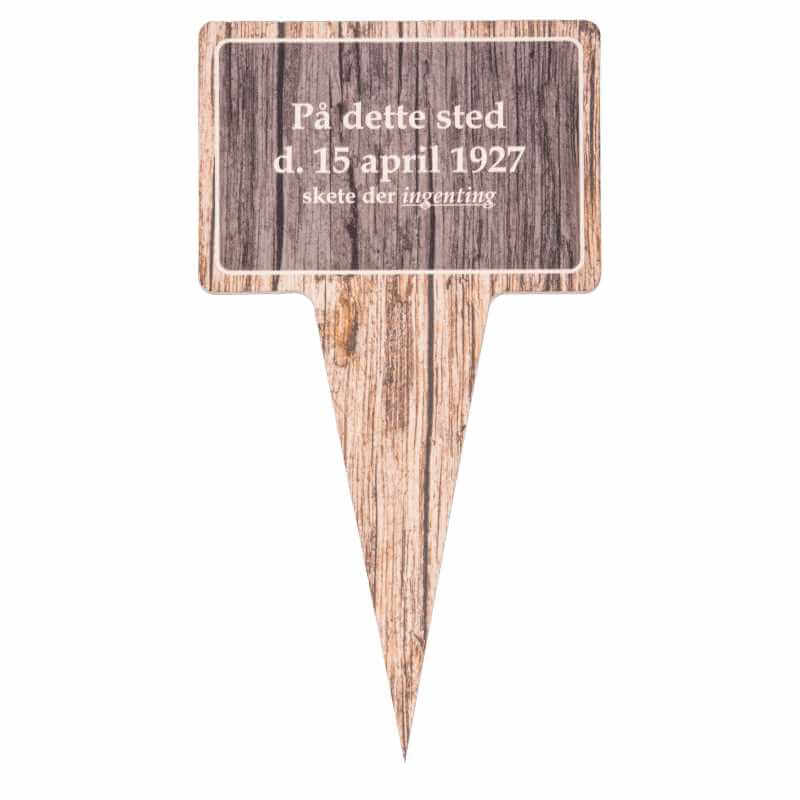 Sjovt planteskilt med teksten “På dette sted d. 15 april 1927 skete der ingenting”.