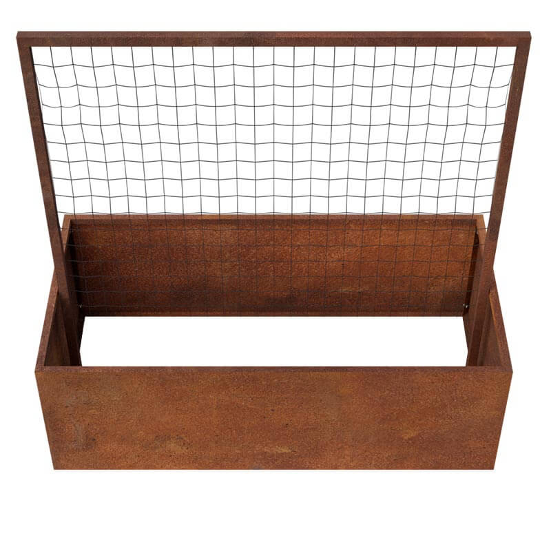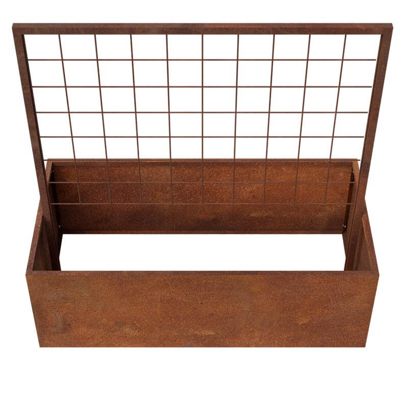 Dette er vores smukke højbed lavet i det flotte og populære materiale Cortenstål, som er udstyret med et espalier, som kan være meget fordelagtig i køkkenhaven, eller til brug som afskærmning.