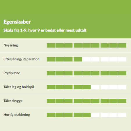 Det betyder at sorterne af græs, som findes i denne skygge græs fra Turfline, er officielt afprøvet igennem 3 år af NaturErhvervstyrelsen. Her tester de den blandt andet for slidstyrke, sygdomsresistens, tørketolerance og skudtæthed.