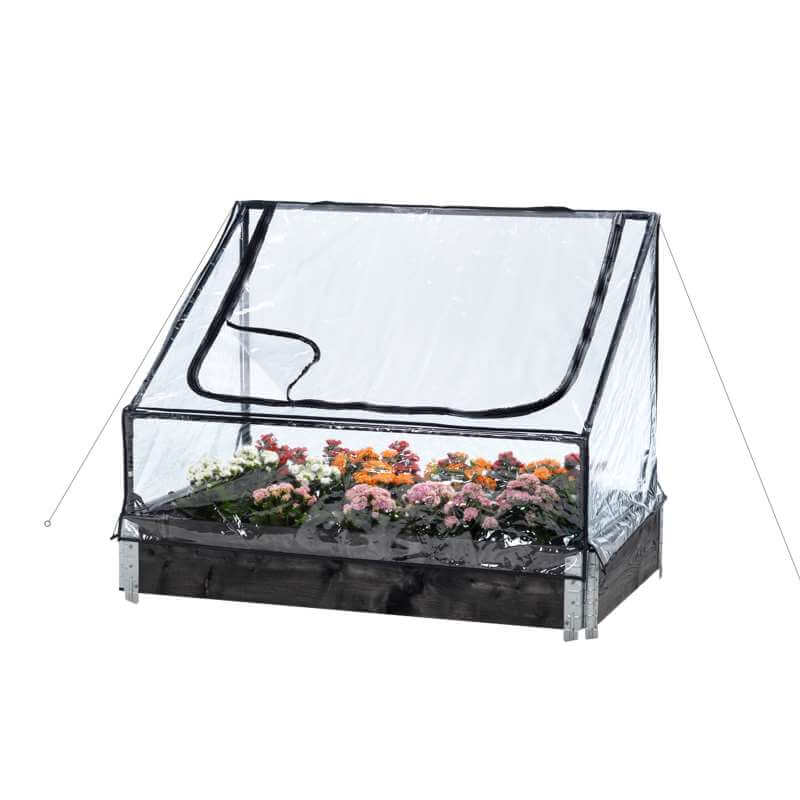 Væksthuset er fremstillet i plastik og syet med sorte kantbånd. Stellet er fremstillet i antracitgrå metalrør.