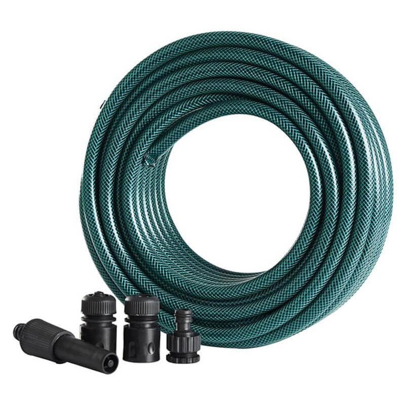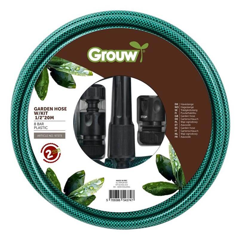 Her får du en praktisk vandslange med et komplet koblingssæt. Vandslangen måler 20 meter i længden og en halv tomme i tykkelse.