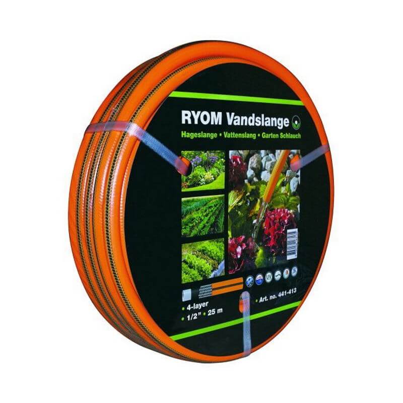 Her får du en ekstra kraftig vandslange, som er armeret i 4 lag. Slangen er 25 meter lang.