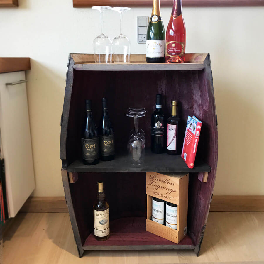 En vinreol lavet af en halv vintønde, er godt et valg fremfor en hel tønde, hvis pladsen er træng.